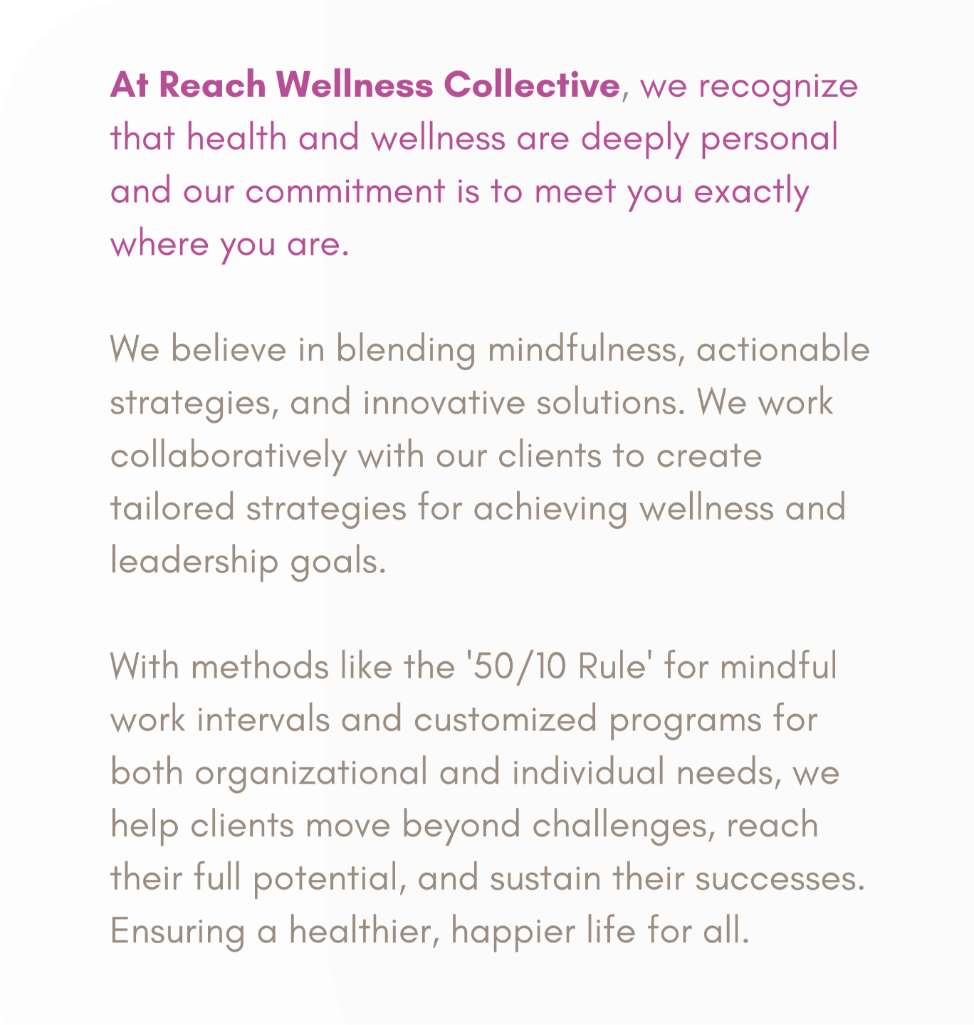At Reach Wellness Collective, we help individuals and organizations take control of their health and well-being by identifying stressors, cultivating healthy habits, and setting realistic goals through customized, actionable plans. Whether you're navigating chronic illness, building a resilient team, or discovering your full potential. Let's create a strategy that works for you.